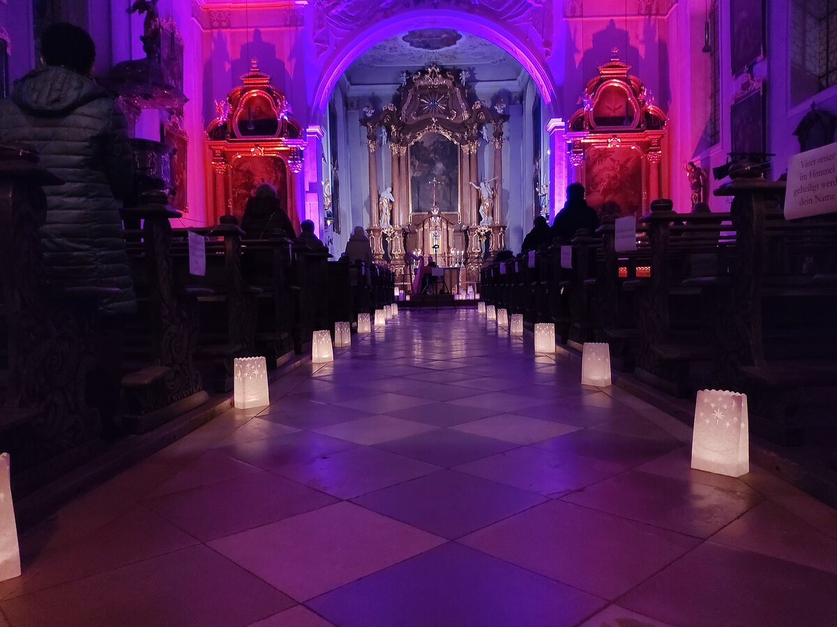 Innenraum einer Kirche mit beleuchteten Papierlaternen entlang des Mittelgangs und Menschen auf den Bänken, violett beleuchtet